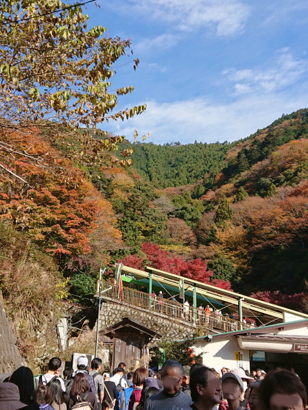 紅葉の真っ只中とあって、大山ケーブル駅はチケット売り場から大行列。繁忙期の山の乗り物はたいていフル稼働で、時刻表とは別にじゃんじゃん増発便出しているそうだけど、それでもおよそ40分待ちだって😱
